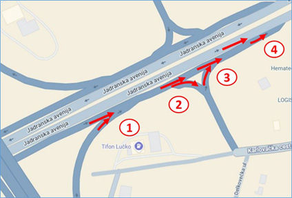 Dalje, vozači vozila prometnog toka A (koji uključuje i vozače vozila prometnog toka B) nastavljaju vožnju prometnom trakom koja se pruža ravno prema točki spajanja s Jadranskom avenijom (u poziciji 4 na grafičkom prikazu slika 2.), dakle u smjeru Zagreba.