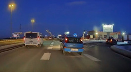 Horizontalnim oznakama prometna traka po kojoj vozi vozač plavoga automobila „nestaje“ i vozač se mora prestrojiti u lijevu prometnu traku. Prestrojavanje je najavio uključivanjem lijevih pokazivača smjera. Prestrojavanje će obaviti nakon što je prilagodio brzinu vožnje i nakon što propusti bijeli kombi koji vozi lijevom trakom.